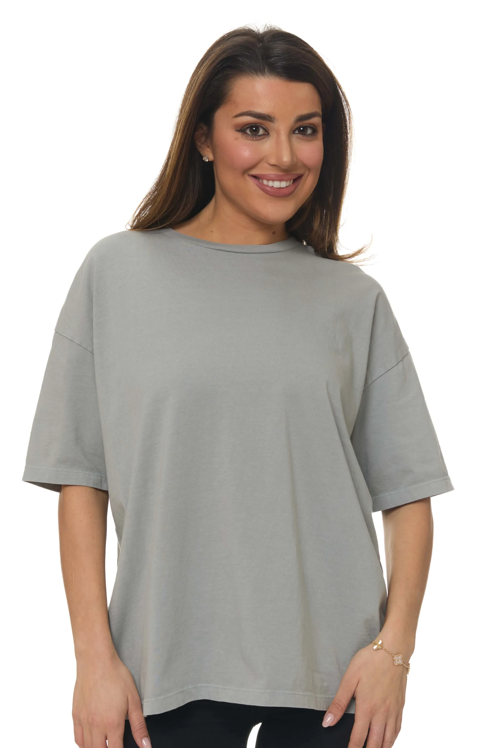 The GG 789 is an oversized, slouchy and easy with a loose feminine crew neck that shows off some clavicle. Slightly short cropped to the mid-waist, it’s the perfect length for untucked but long enough for a loose tuck.